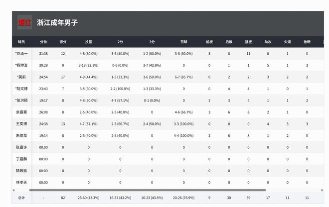 浙江男篮吴前17分2板3助1断,王奕博13分1板3助3断,刘泽一12分11板,余嘉豪8分8板。