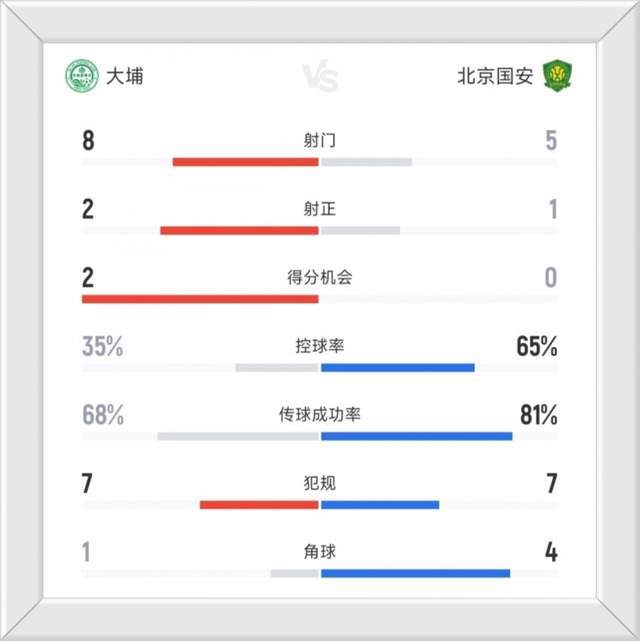 但从比赛开始之后的表现看,国安空有控球率的优势,真正有威胁的进攻几乎没有,反而是大埔队效率更高。